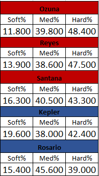 Now, Santana played about 20 more games than Rosario and Kepler, so he may not hit quite as many home runs all things being equal. With that said, look at Santana’s walk-rate and strikeout-rate! Santana has always possessed superior plate discipline skills but he set a new career high in OBP in 2019. Keep in mind, this is not a skill that diminishes over time, like speed. Santana could very well repeat this performance, while potentially receiving a boost in a couple of categories if Francisco Lindor, Jose Ramirez and Franmil Reyes are able to stay on the field and contribute consistently. What’s impressive here is that Santana has both Rosario and Kepler beat in almost every rate statistic (BB%, K%, AVG, etc.). He also has the highest hard hit rate of the three at 43.3%, although Kepler is not far off at 42%, while Rosario finished at 39%. It’s now obvious that Rosario’s performance, currently, can be acquired at a discount, allowing owners to maybe move in on a increasingly scarce position like first base (Josh Bell ADP:93) or starting pitcher (Jose Berrios: 89, Corey Kluber:95).